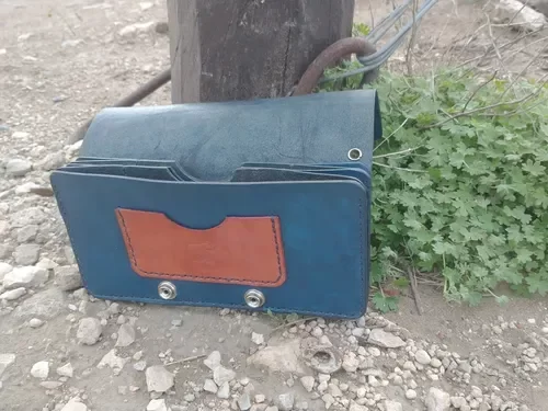 billetera de cuero con doble fuelle en color celeste.