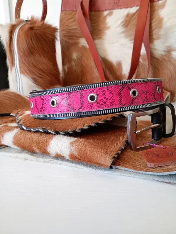 Decoración cierre falso con cuero grabado piton en color rosa.